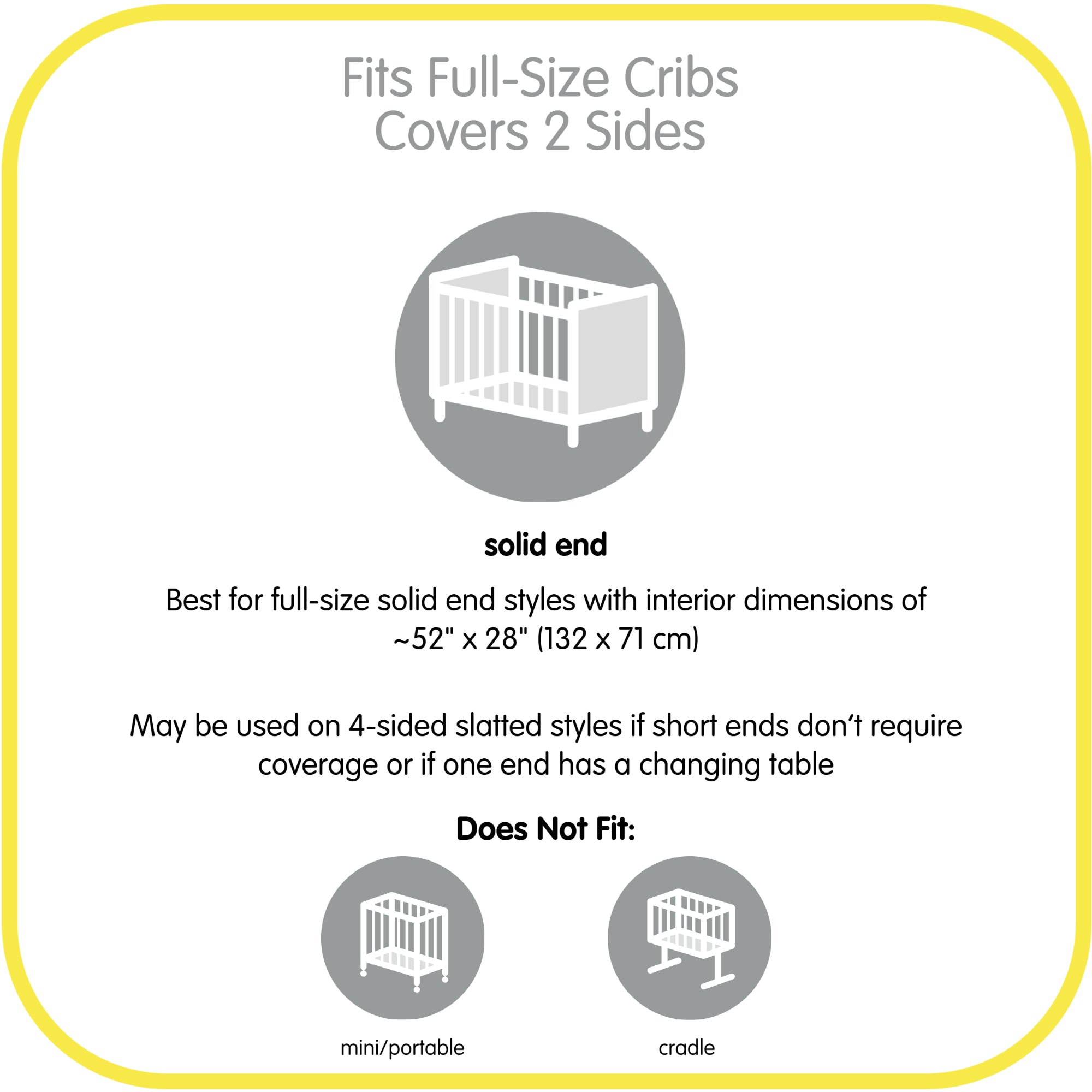 - FITS FULL-SIZE STYLES WITH A 52" x 28" (132 CM x 71 CM) MATTRESS: Install two 11" x 58" (28 cm x 147 cm) panels to cover 2 sides. Can be used on styles with 2 solid ends or 1 solid end e.g. an attached changing table. Do not use with mini cribs.