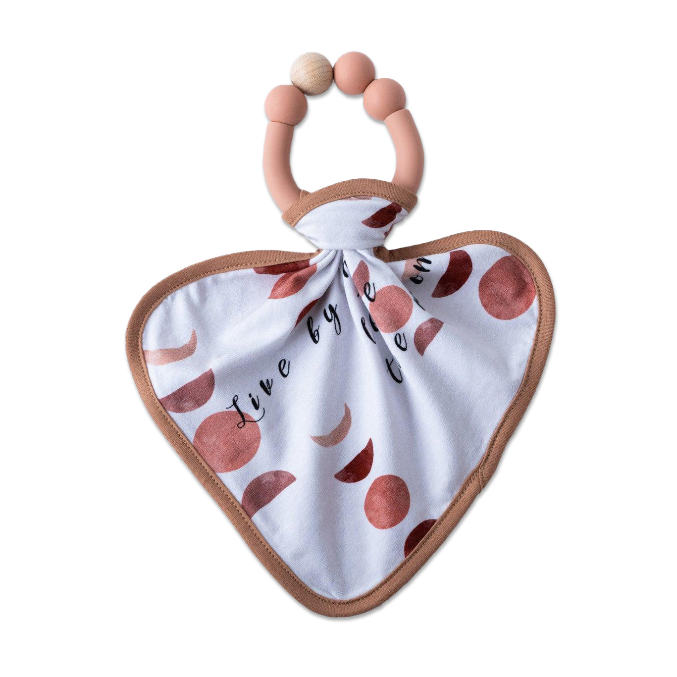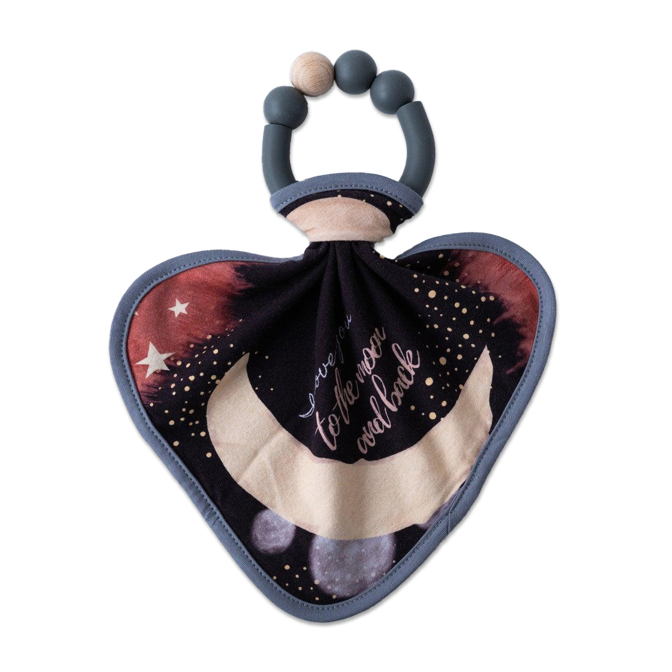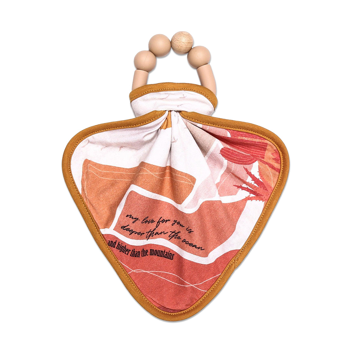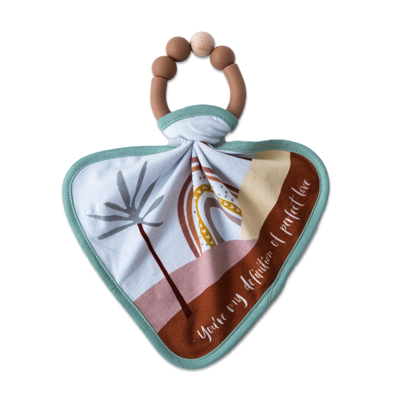 Our teether comes with an attachable mini lovey with boho-chic custom illustration.