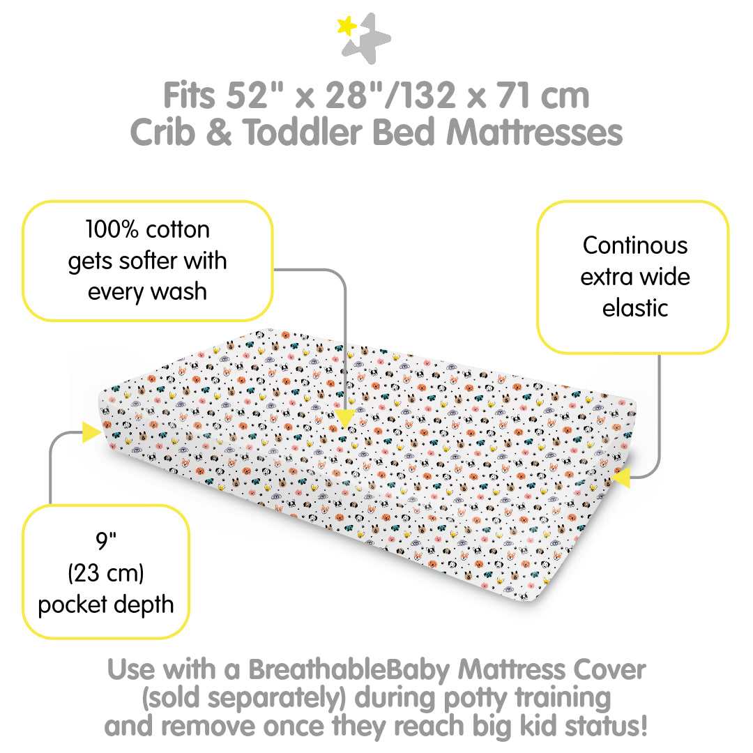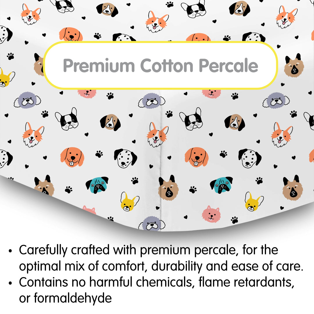 • Cotton Percale Fitted Sheet, For 52" x 28"/132 x 71 cm Crib & Toddler Bed Mattress, Dogs (2-Pack)