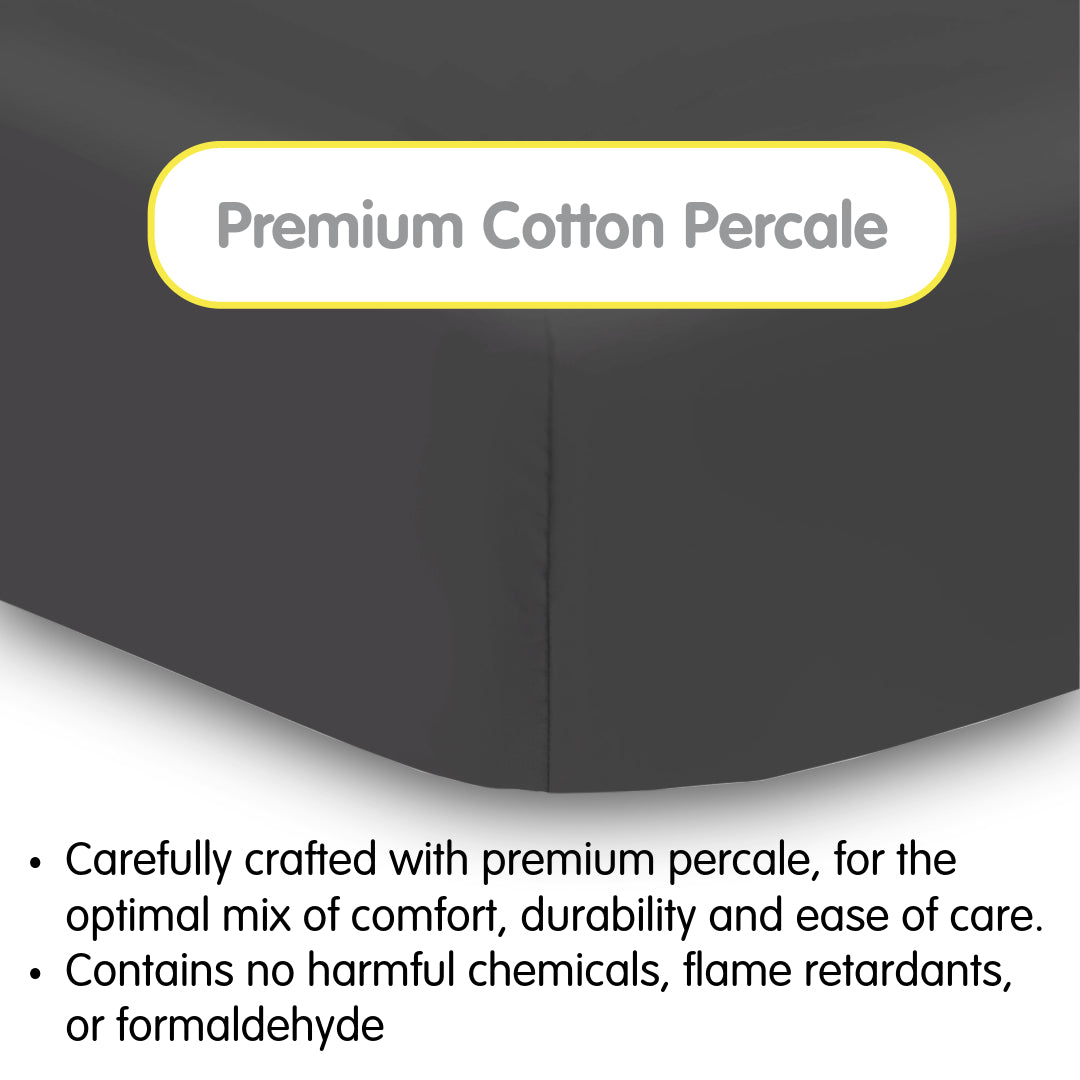 • PREMIUM COTTON PERCALE FITTED SHEET: Provides the optimal mix of comfort, durability and easy care. No added chemicals, flame retardants or formaldehyde.