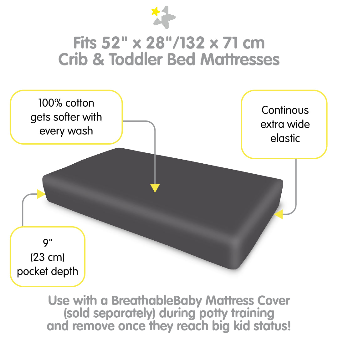 • EXTRA DURABLE & LONG-LASTING: 200 thread count makes these sheets extra durable to last through the toddler stage. Use with a BreathableBaby Mattress Cover (sold separately) during potty training!