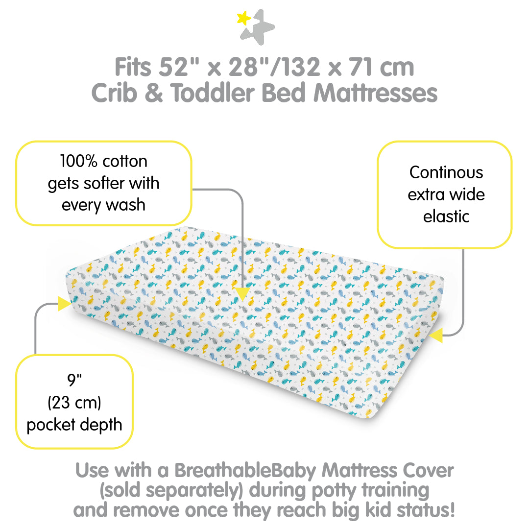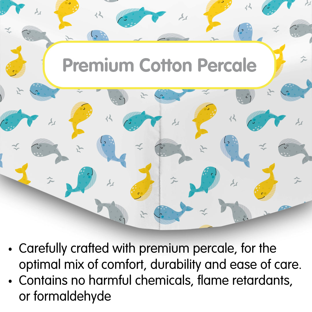 • Cotton Percale Fitted Sheet, For 52" x 28"/132 x 71 cm Crib & Toddler Bed Mattress, Whales (2-Pack)
